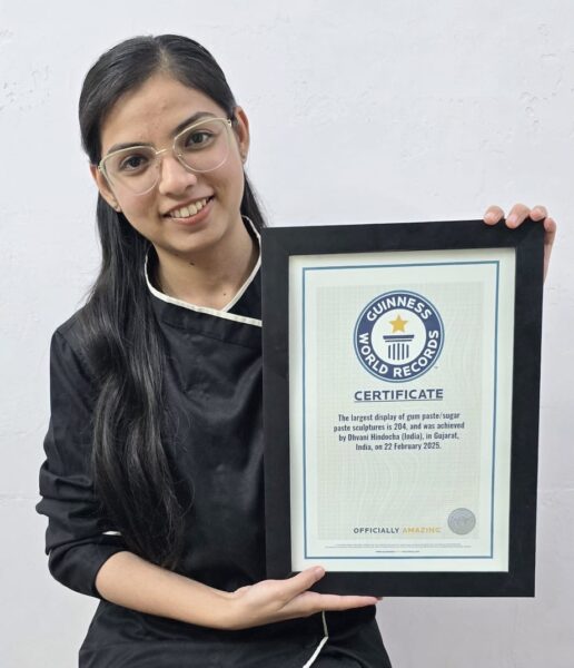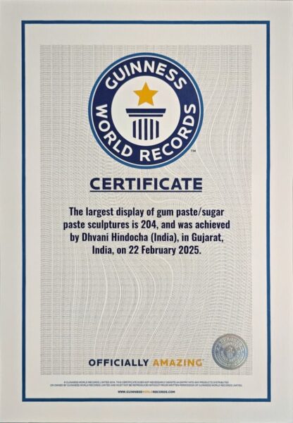 ‘ The largest display of gum paste/sugar paste sculptures is 204, and was achieved by Dhvani Hindocha, in Porbandar, Gujarat, India, on 22 February 2025. ‘